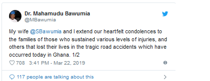 Vice President Mahamudu Bawumia has extended his condolences to the families of those who lost their lives in the tragic road accidents that occurred on the kintampo-techiman road.